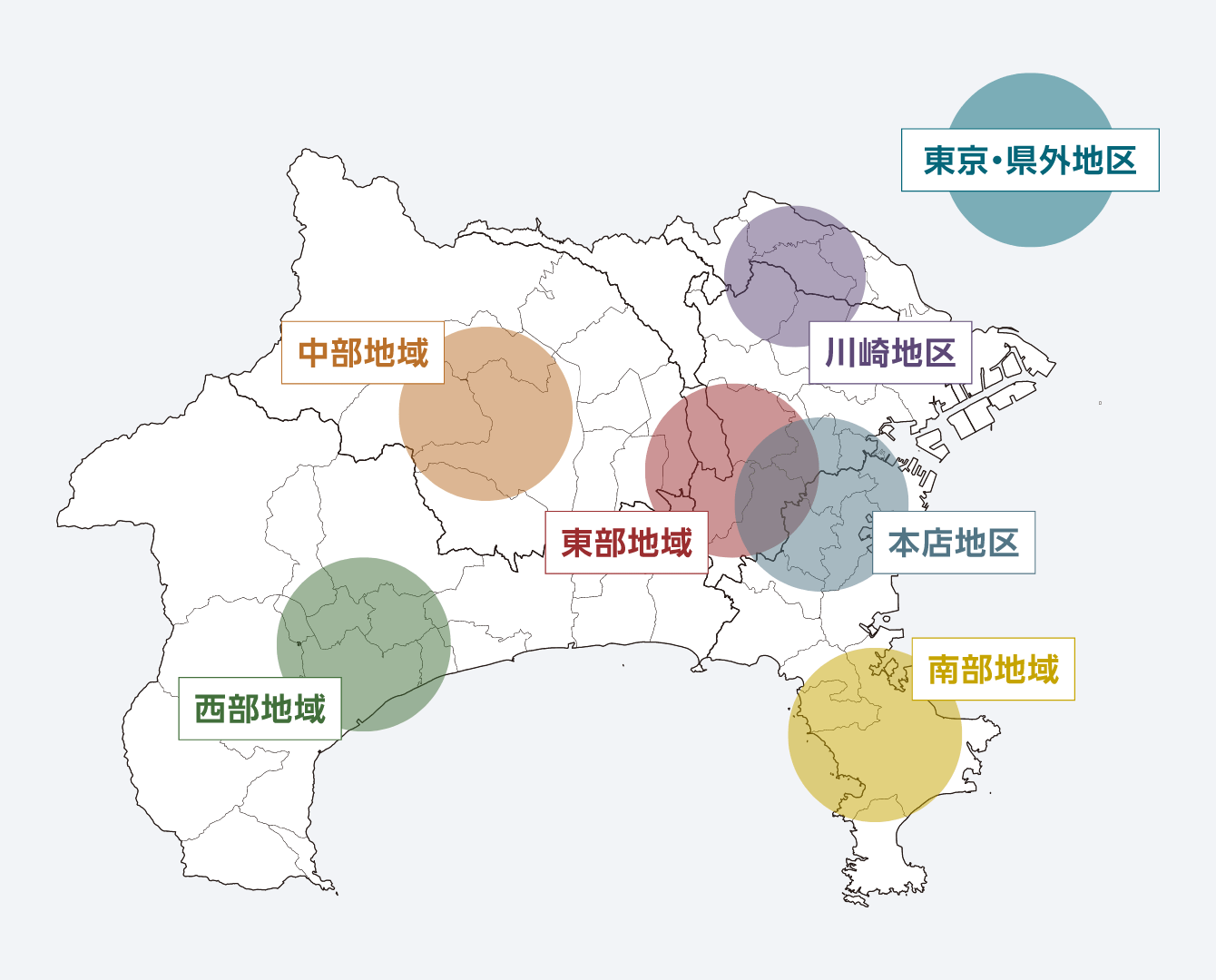 こうした地域の特性に応じたソリューションを提供するため、横浜銀行では営業エリアを3地区(本店、川崎、東京・県外)・4地域(東部、中部、西部、南部)に編成し、各地区・地域に配置した本部長が地域経営者の役割を担う「地域本部体制」を整備。「まちをつくる」「ひとの流れをつくる」「しごとをつくる」など、地域や社会の課題解決に向けた取り組みを進めています。